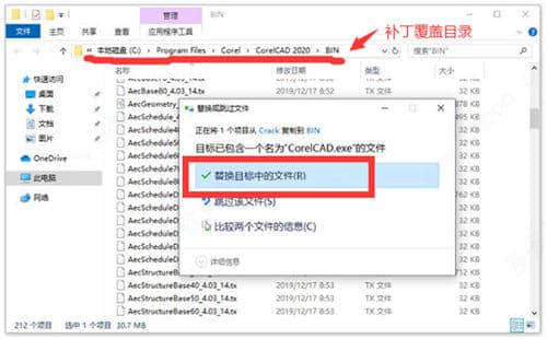 2.根据提示,退出直到软件安装完毕,打开解压包中的Crack文件夹,将破解后的补丁corelcad2020粘贴到corelcad2020安装目录的bin文件中进行替换。软件默认安装位置为:C: 程序文件 CorelCAD 2020 bin。
