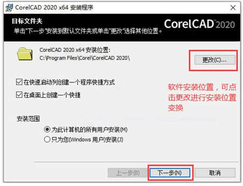 1.下载并解压,双击corelcad 2020x64.exe程序,默认挂钩选项和安装位置,点击下一步安装。