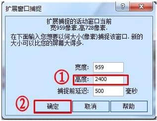 2.弹出“扩展窗口捕捉”窗口对话框,在高度文本框中输入“2400”。记得留足高度,否则无法完成截图,宽度可以忽略。软件会自动获取窗口宽度。