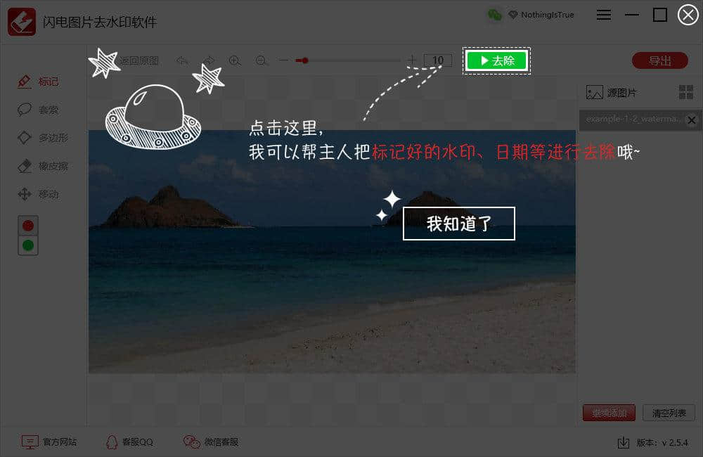 1.快速易用:一款图片水印去除工具,可以去除水印、标记、划痕等。一键点击图片。此外,该软件还支持批量去除图片中的水印和日期的功能,可以轻松去除图片水印。