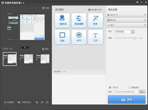 美图秀秀批量处理是一个简单易用的图片处理编辑器。与标准版不同,它允许您批量处理图片,并一次性修改图片的大小、质量和各种美化效果。为用户节省了大量时间,提高了工作效率,让您的工作更轻松、更方便!