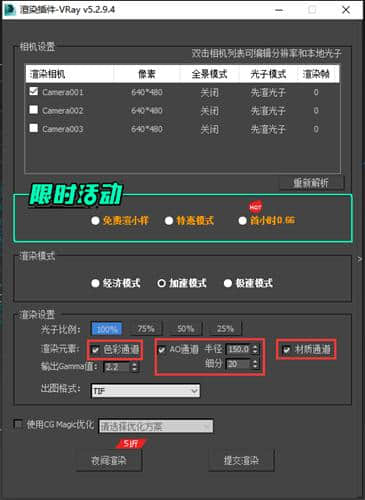 渲云增加颜色通道、AO通道、材质通道可选选项,用户可以根据实际需要勾选使用通道渲染。