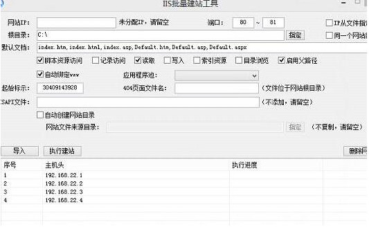 iis批量建站助手是一款免费的iis批量建网站工具,只需要简单的配置,瞬间就能建一万多个网站。专为站长设计,作为一个简单的IIS管理工具,只需要简单的配置,一万多个站点瞬间搭建完成。该工具可以快速自定义网站域名、访问端口、目录、默认文档和目录等。
