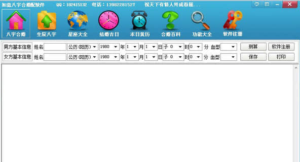 如意八字合婚配此外,软件根据双方的基本信息计算订婚和结婚日期。该软件还提供详细分析生日、详细分析星座、民俗、数字吉祥、命运百科等功能。软件的主要计算内容可以打印保存。
