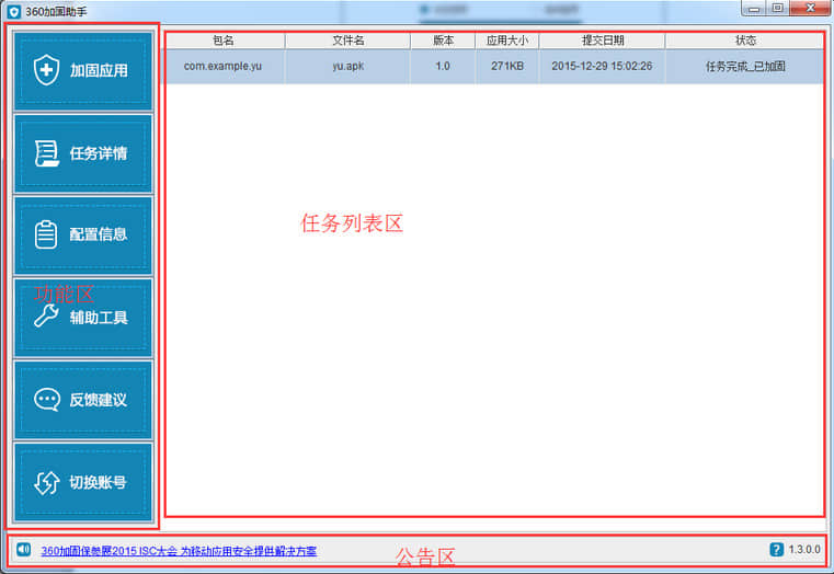为了满足群众的需求,加固团队在网页加固后推出了PC端360加固助手。用户只需打开360加固助手软件,一键上传APK,即可自动完成应用加固、签名、多渠道打包。360加固助手是360加固保护的PC端产品。加固保护为移动应用提供专业的安全保护,可以防止应用被逆向分析、反编译和重新打包,防止病毒、广告等恶意代码被嵌入,从源头上保护数据安全和用户利益。