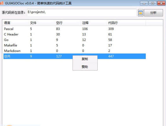 GUI4GOCloc代码统计工具不需要连接网络,没有网站,没有注册表,随意使用。