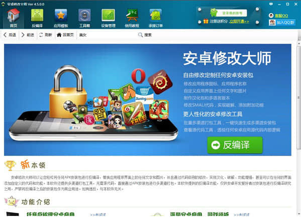 安卓修改是一款多功能的安卓app修改工具。安卓修改可以让您轻松将任何APK安装包进行反编译,替换应用程序界面上的任何文字和图片,并且通过代码级别的修改,实现汉化、破解、功能增强,甚至可以在任何的界面添加自定义的代码和功能。本软件还提供多渠道打包工具,无需源代码,直接通过APK安装包进行多渠道打包。