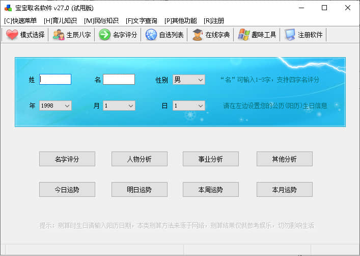 宝宝取名破解版免费下载主要用于系统软件非常不错的起名的电脑软件,创佳软件园小编给各位带来了宝宝取名下载以及使用介绍,需要这款宝宝取名v27.0软件的朋友们,欢迎跟小编一起了解一下这个软件有什么不同吧!快来创佳软件园下载使用吧!