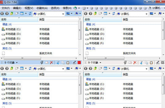打开出现Q-dir的四个窗口,在不同的磁盘上访问同一个窗口中的多个文件夹pin,并执行粘贴、修改和移动文件中的内容等操作。