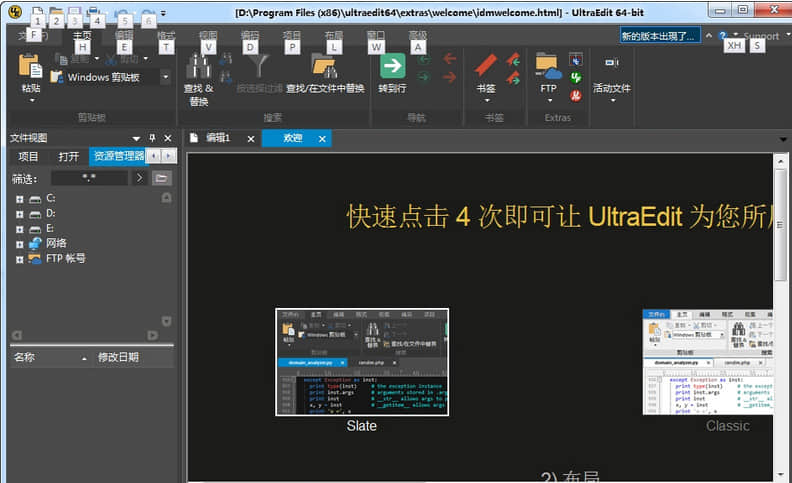 UltraEdit 64位功能强大且高性价文本编辑器。可以编辑文本、十六进制、ASCII 码,可以取代记事本,内建英文单字、C++及VB指令突显,可同时编辑多个文件,而且即使开启很大的文件速度也不会慢,软件附有HTML标签颜色显示、搜寻替换以及无限制的还原功能,一般大家喜欢用其来修改EXE或DLL文件,是一款能够满足你一切编辑需要的编辑器。
