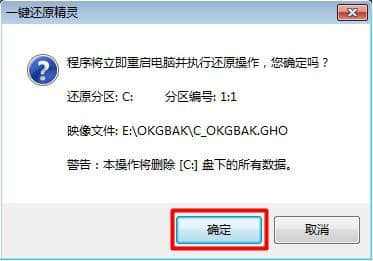 2.这时会弹出一个提示:程序会立即重启计算机,执行还原操作,告诉我们备份磁盘分区和备份路径。确认后,我们只需要点击“确定”按钮,如图所示: