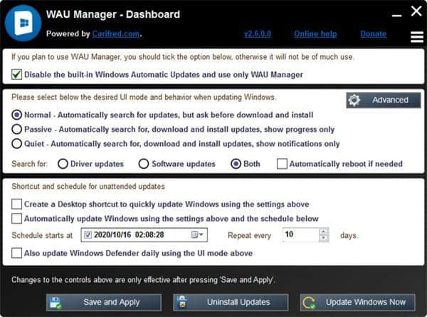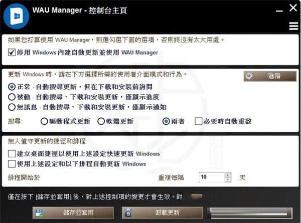 WAU Manager软件下载可用于管理和控制电脑的自动更新功能。WAU Manager电脑更新管理工具可以让你的电脑管理自动更新模式,让电脑的自动更新状态和自动状态得到充分的控制,让你的电脑保持当前状态,不用频繁更新也能更好的使用。