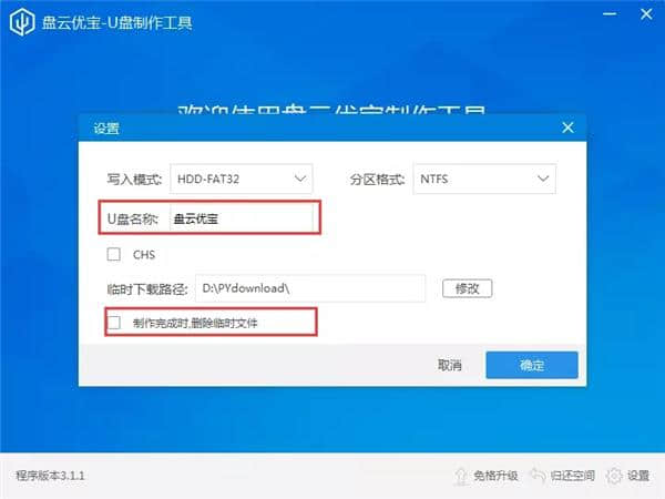 1.打开盘云优宝软件,点击右下角的齿轮图标,会弹出设置窗口,用户可以在这里设置需要的u盘,如名称、临时下载路径等。