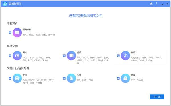 可以选择各种文件和特定类型的数据进行扫描和恢复。