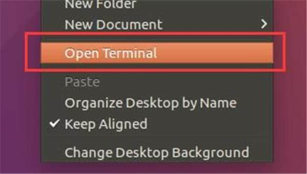 2.在Ubuntu的空白窗口中右键,从下拉列表中选择“打开终端”,粘贴的指令,点击回车键后输入相关密码,操作成功后关闭终端。