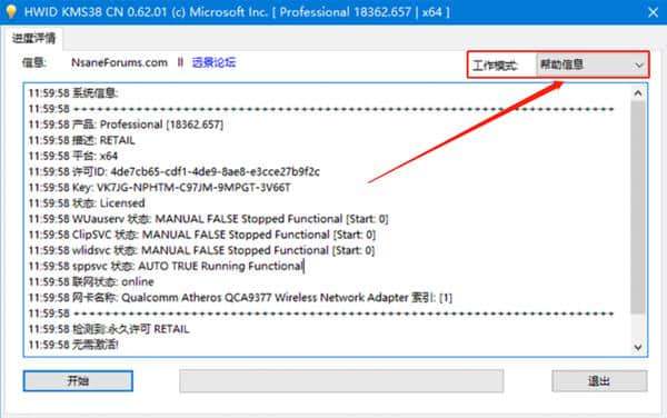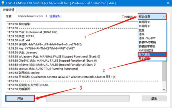 8.点击工作模式下拉框,找到并点击“数字激活”,点击左下角的“开始”按钮;