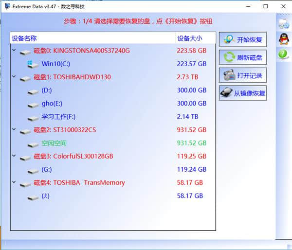 1.打开软件后,选择需要恢复的磁盘,点击开始恢复。