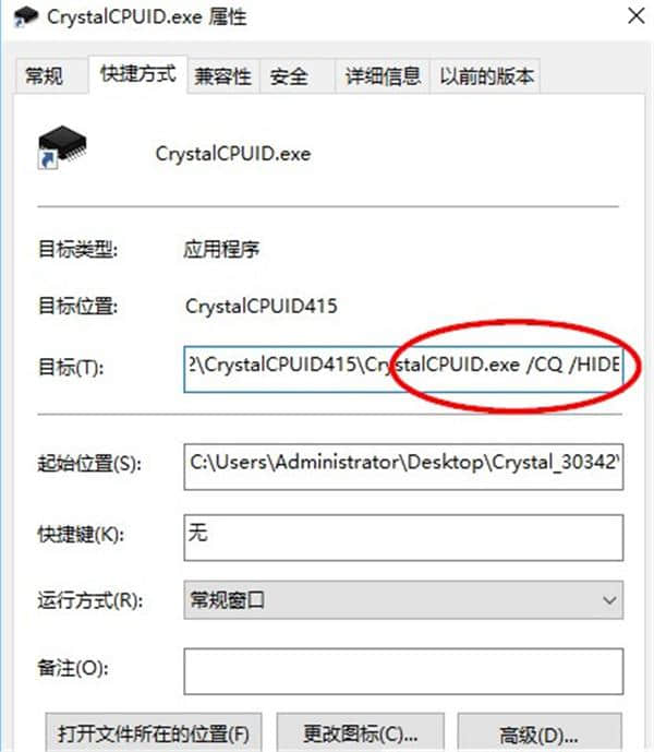 4.创建程序的快捷方式打开属性函数,并在目标框中添加一个空格/CQ空格/HIDE。