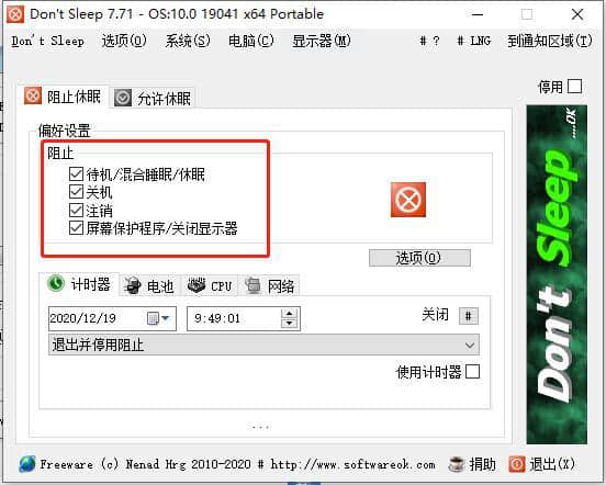 2.休眠防止设置:Dont Sleep绿色版本包含首选项,可以设置各种属性。