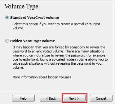 3.在这一步中,您需要选择是创建标准卷还是隐藏VeraCrypt卷。
