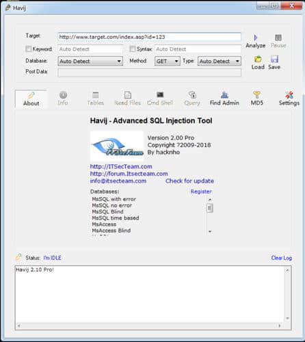 havij免费版免费下载主要用于系统软件功能强大的SQL注入工具的电脑软件,创佳软件园小编给大家送上havij软件下载和相关介绍,需要这款havijv1.19软件的朋友们,欢迎跟小编一起了解一下这个软件有什么不同吧!快来下载吧。