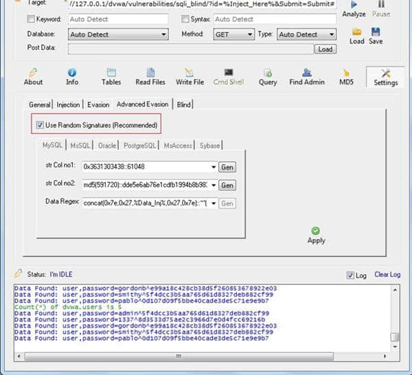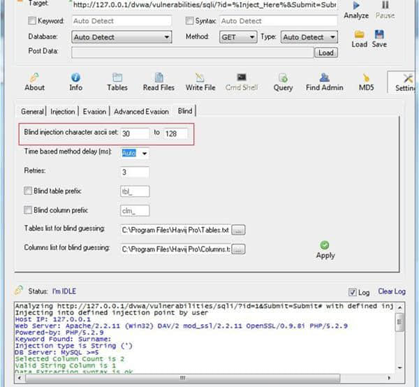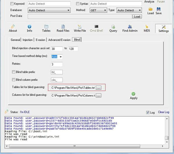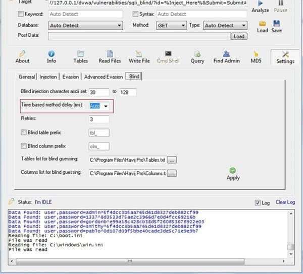 3.如果设置为“自动”,havij将自动选择最合适的延迟值。