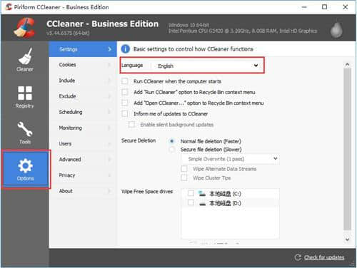 2.当我们点击“语言”后的选择框时,会出现一个下拉菜单。菜单上有几十种语言。我们应该选择“中文(简体)”,意思是简体中文。选择后,CCleaner软件界面变为中文。