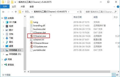 2.CCleaner文件夹包含一个子文件夹和八个文件。我们需要用鼠标左键双击打开“CCleaner。exe”应用程序。