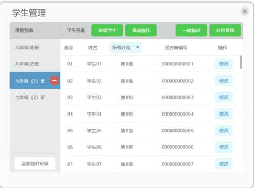 点击【学生管理】按钮,进入【学生管理】页面,可以新建、删除班级、新增学生、修改学生、分组学生。