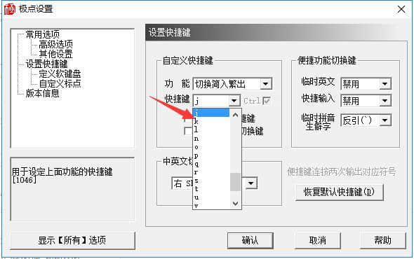 2.将打开的新窗口切换到“设置快捷键”功能页面,在“自定义快捷键”下,将“功能”设置为“切换简单输入和复杂输出”。在下面的“快捷键”栏中,可以随意选择自己喜欢的快捷键。注意后面的“Ctrl”是默认勾选的,所以使用快捷键的时候需要同时按“Ctrl”键。
