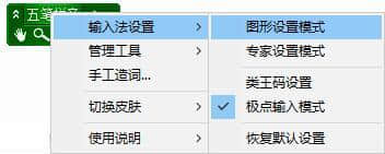 1.在极点五笔输入法工具栏上点击鼠标右键,将鼠标指向右键菜单中的“输入法设置”列,点击子菜单中的“图形设置模式”选项。