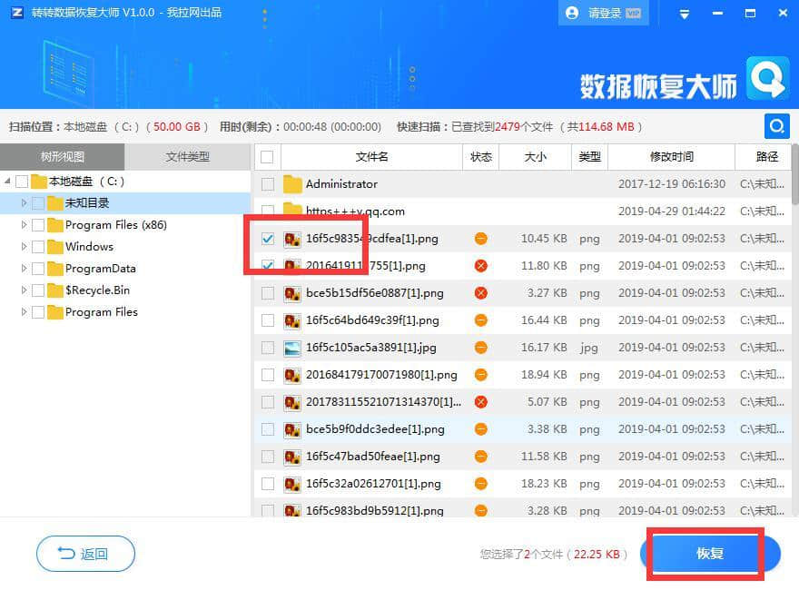7.扫描后,我们可以从列表中选择要恢复的文件,然后单击恢复。
