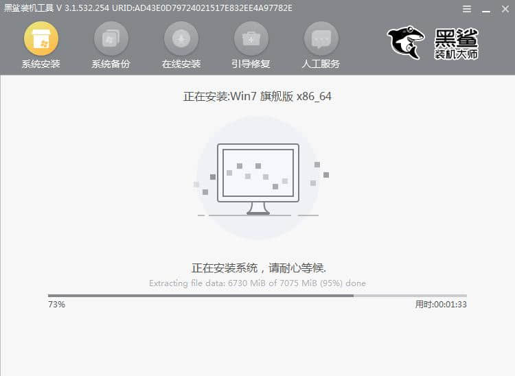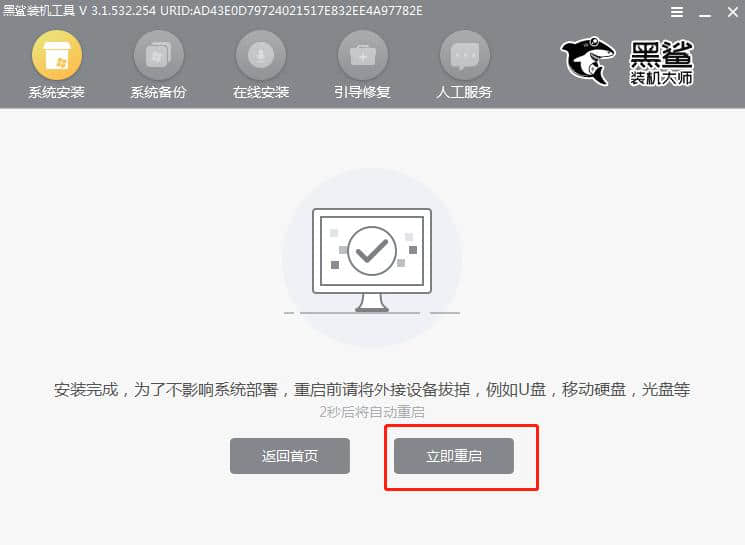 第六步:黑鲨开始自动安装win7,安装完成后立即“重启”电脑。