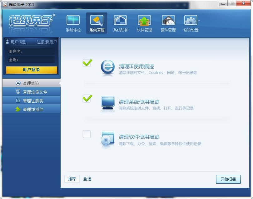 1)选择超级兔子界面顶部的[清除]选项。进入清理界面后,选择需要清理的选项,点击【开始扫描】。