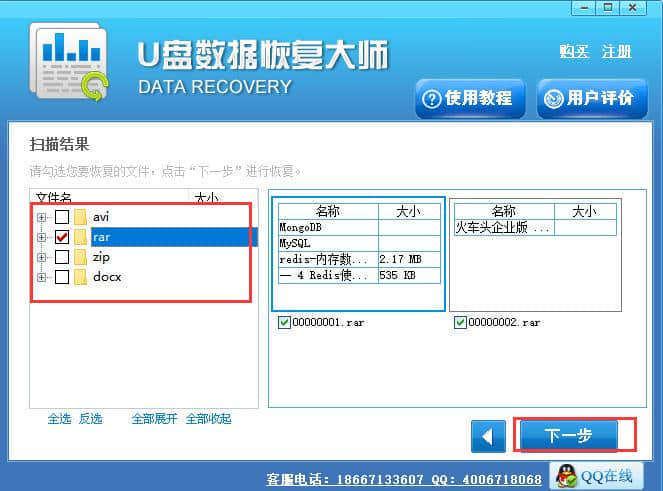 5.等U盘数据恢复免费版扫描完成后,会出现下图所示的界面。我们可以在界面左侧看到被删除的文件,选择需要恢复的数据,点击界面底部的下一步。