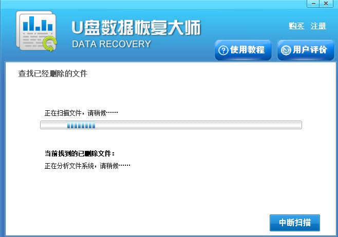 4.接下来,U盘数据恢复软件会扫描u盘中丢失的文件,如下图所示,界面中会显示当前找到的文件,这个扫描过程需要一点时间,需要大家耐心等待。