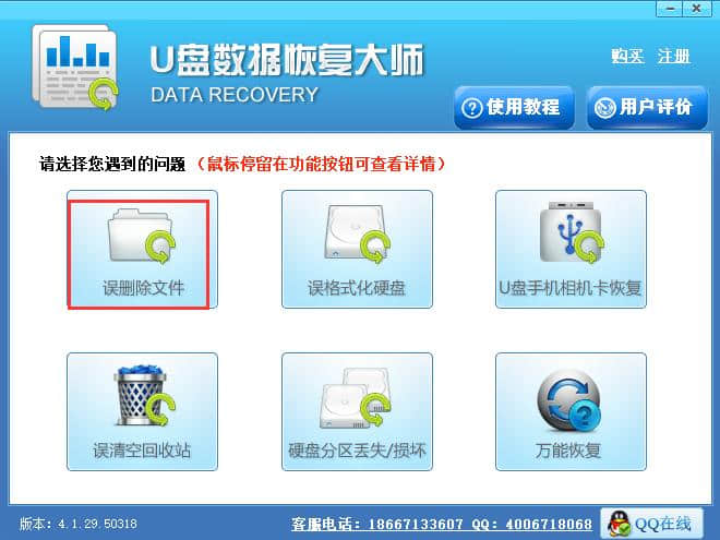 1.首先,我们打开U盘数据恢复软件,点击界面中的“误删文件”选项,进入下一步。