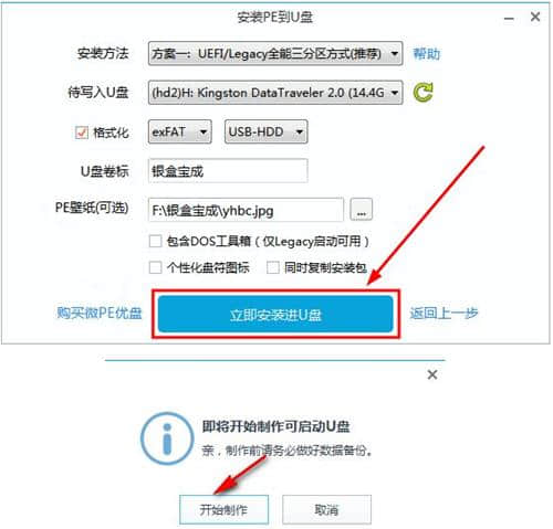 5.点击【立即安装到u盘】按钮,启动u盘的PE引导盘,软件会提示再次备份数据。如果没有问题,单击[开始]按钮。