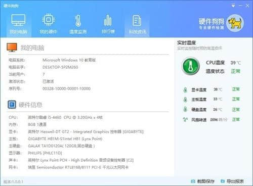 1.启动主页,这是“我的电脑”的硬件概述。这里,硬件狗狗展示了版本、激活状态、CPU、内存、显卡、主板、硬盘、显示器、声卡、网卡等主要硬件核心。,让普通用户一眼就能看到自己的电脑状态。