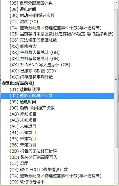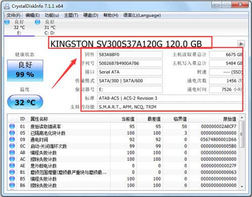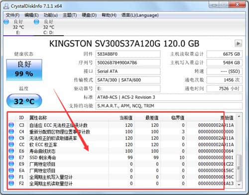 4.在crystaldiskinfo下,可以看到硬盘的数据,显示当前值、最差值、临界值等。,可以快速比较硬盘的健康状态。