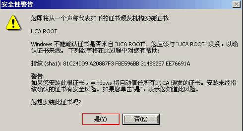 2.如果在安全设置屏幕后没有安装根证书,将出现下图。单击“是”成功安装根证书。