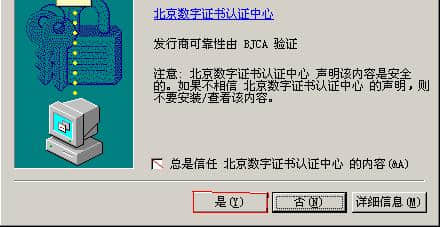 1.点击安装BJCA根证书后,会出现如下图所示的安全设置警告。点击“是”,在始终信任之前打勾。