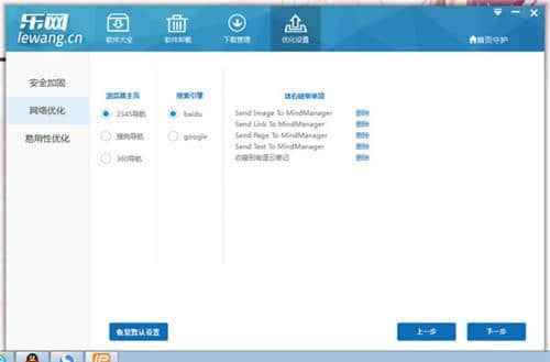 点击“优化设置”和“网络优化”,设置浏览器主页和默认浏览引擎。
