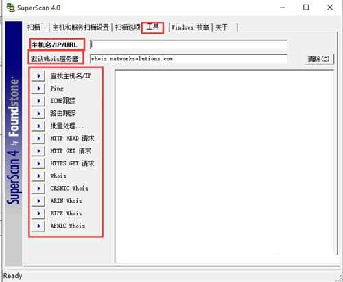 4.最后可以点击“工具”选项,在界面中设置主机名/IP/URL和默认whios,我们可以根据自己的需要进行设置。