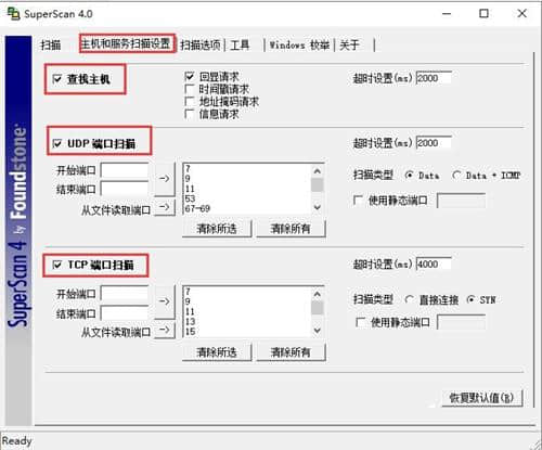 2.接下来,单击界面中的“主机和服务扫描设置”选项。如下图所示,我们可以设置查找主机、UDP端口扫描、TCP端口扫描等选项,然后进行下一步。