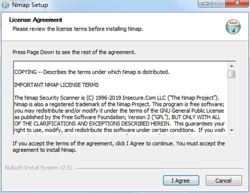 1.在这个网站上下载Nmap这个软件的压缩包。解压缩后,双击exe文件,检查软件许可协议,然后单击我同意。