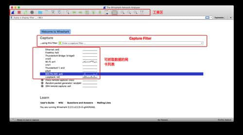 当打开Wireshark时,您可以看到三个区域。顶部是工具栏区域,您可以在这里开始捕获和停止捕获。