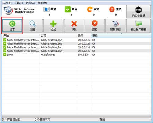 2.单击“检测”以检测本地计算机上需要升级和更新的应用程序。