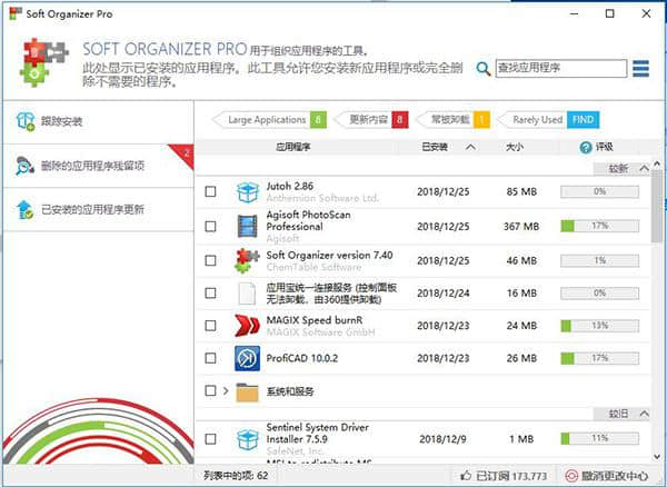Soft Organizer Pro免费版免费下载是属于系统软件的一款提升你的系统空间,给予更进一步的优化环境电脑软件,创佳软件园小编给大家带来Soft Organizer Pro下载和介绍,小编亲测Soft Organizer Pro7.40后觉得还不错,值得一用!喜欢的话可以来创佳软件园下载!