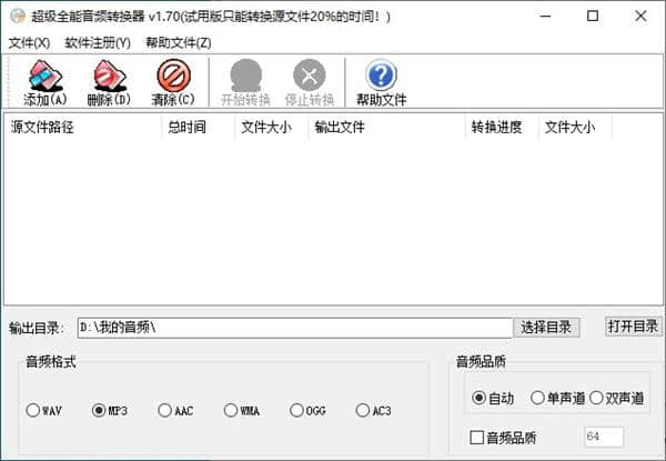 超级全能音频转换器免费版免费下载是应用软件的一款专业的音频编辑工具电脑软件,创佳软件园小编接下来不仅仅给各位带来超级全能音频转换器版本:1.70下载还有相关介绍,总体来说这款超级全能音频转换器1.70软件通常比较操作简单容易上手,是很多用户必备选择,快来下载吧,